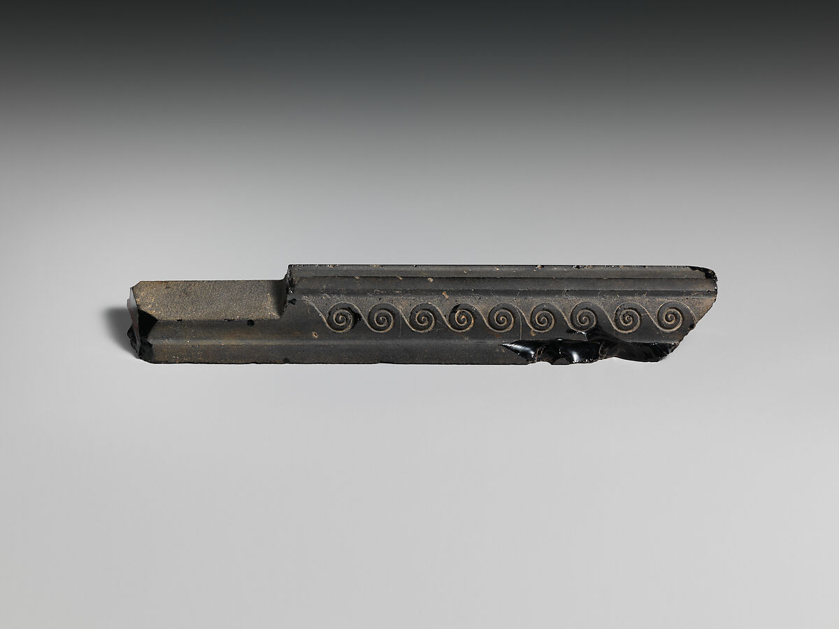 Obsidian was used in Hellenistic and Roman times for luxury vessels and composite statuary. This is a very rare example of its use as a decorative fitting, probably for a chair or couch.
