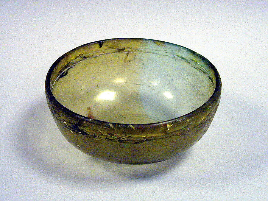 Hemispherical and conical bowls were two of the most common and popular shapes of the Late Hellenistic period. They were fashioned not only in glass but also in metal and pottery. Those made of glass were later supplanted by deeply colored varieties and by bowls decorated with tooled ribs.