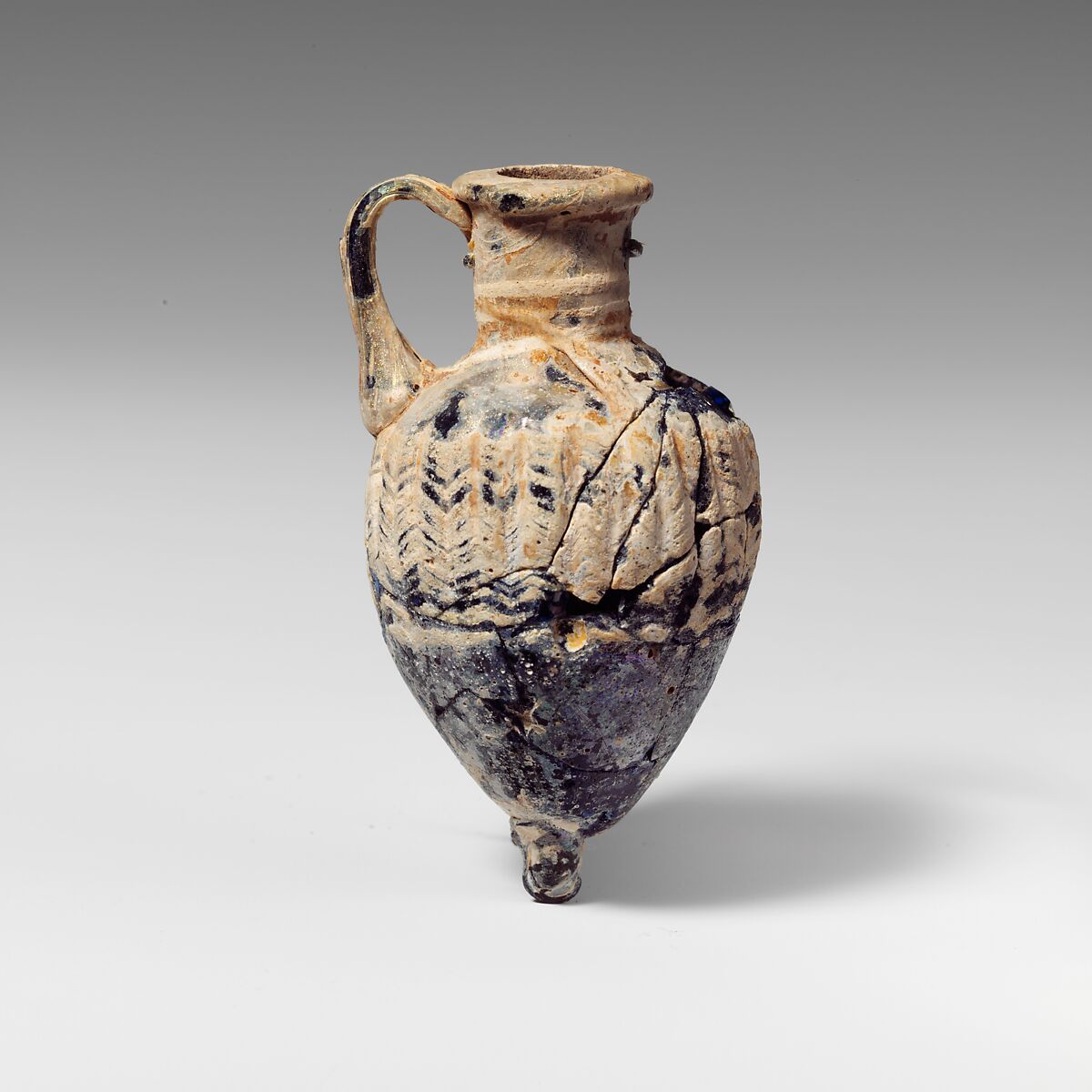 Broken and repaired, with several holes in body and second handle completely missing; dulling, pitting, and iridescence, with large areas of thick, milky weathering.