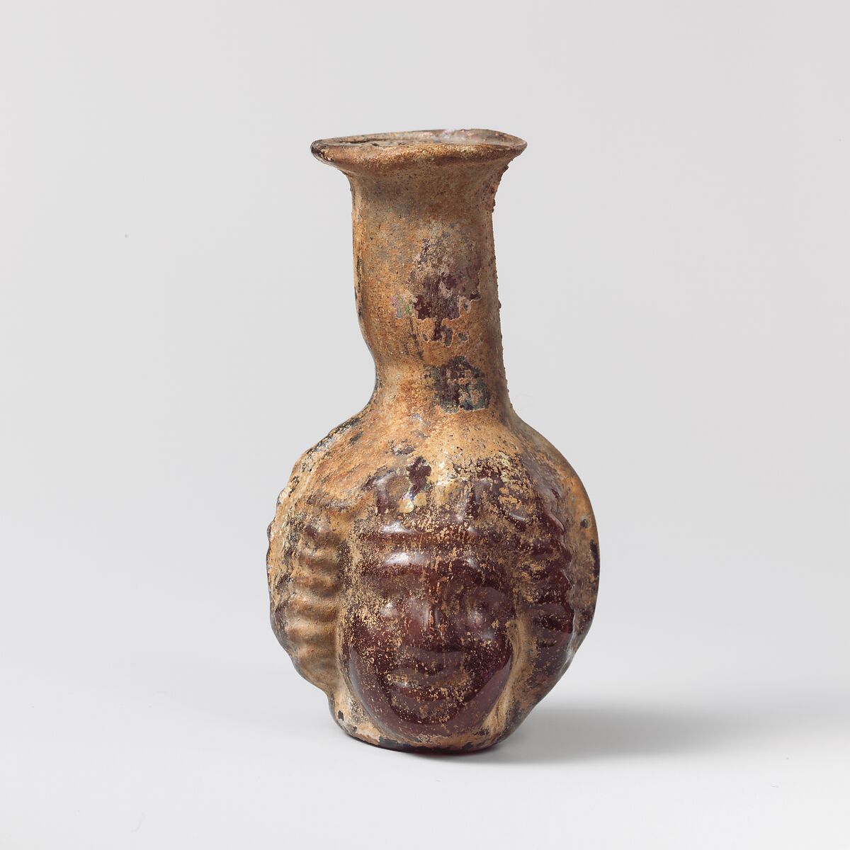 Although the details on two heads are indistinct, the fact that the smiling face wears a fillet or headband and the serious face may have small curved horns on his temples suggests that they may be identified as the wine god Dionysos and a satyr respectively.