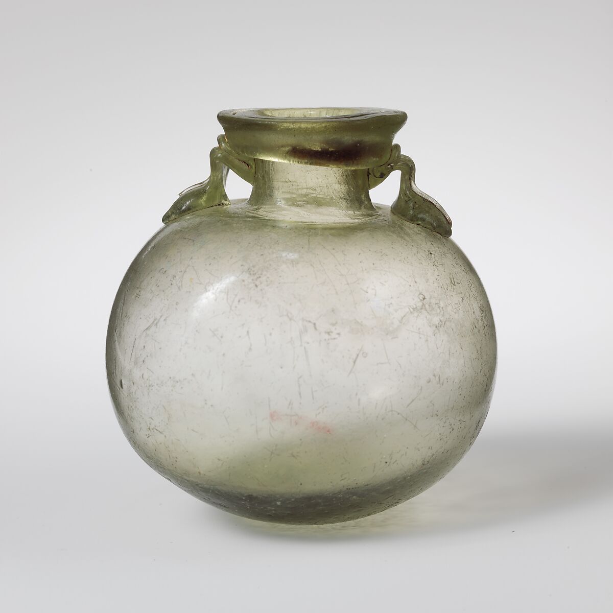 Collared rim folded out, down, round, and up, and flattened on top, with projecting outer flange; short cylindrical neck; globular body; rounded bottom; two small handles applied to top of body in round pads, drawn up, and trailed on to neck and underside of rim.