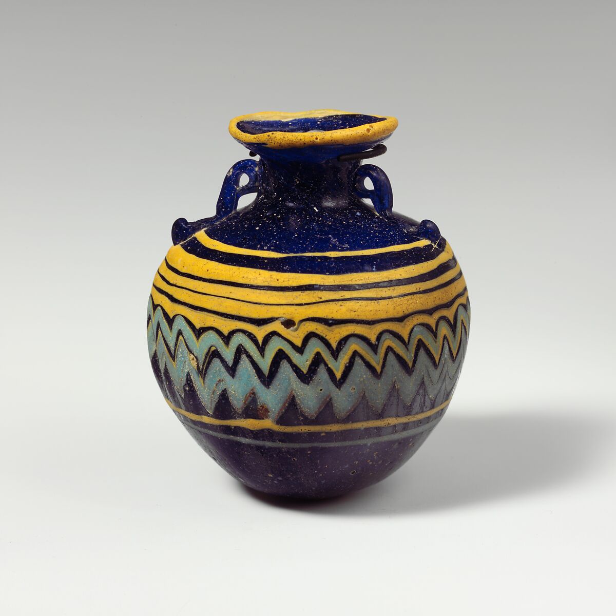 A yellow trail applied to outer edge of rim-disk; another broad yellow trail applied on upper body and wound down in spiral, at first in horizontal lines, then tooled into a close-set zigzag pattern around central section of body, formed by uneven, shallow vertical tooling indents; a second trail in turquoise blue added to middle of body, mingling with the yellow trail; below zigzag pattern, a yellow and a turquoise blue trail wound once round body .