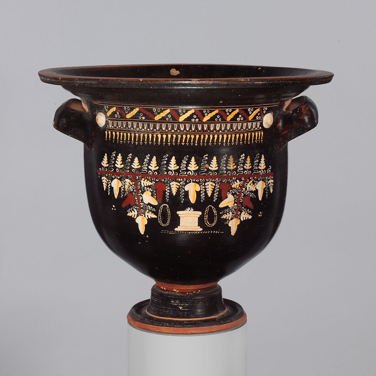 The motifs depicted here are more than purely decorative. The pendants reflect a contemporary predilection for embellishing vases with necklaces. This tradition continued even into Roman painting—note the Black Bedroom from Boscotrecase. The grapevine here alludes to Dionysos, god of wine, while the altar may indicate his connection with the theater.