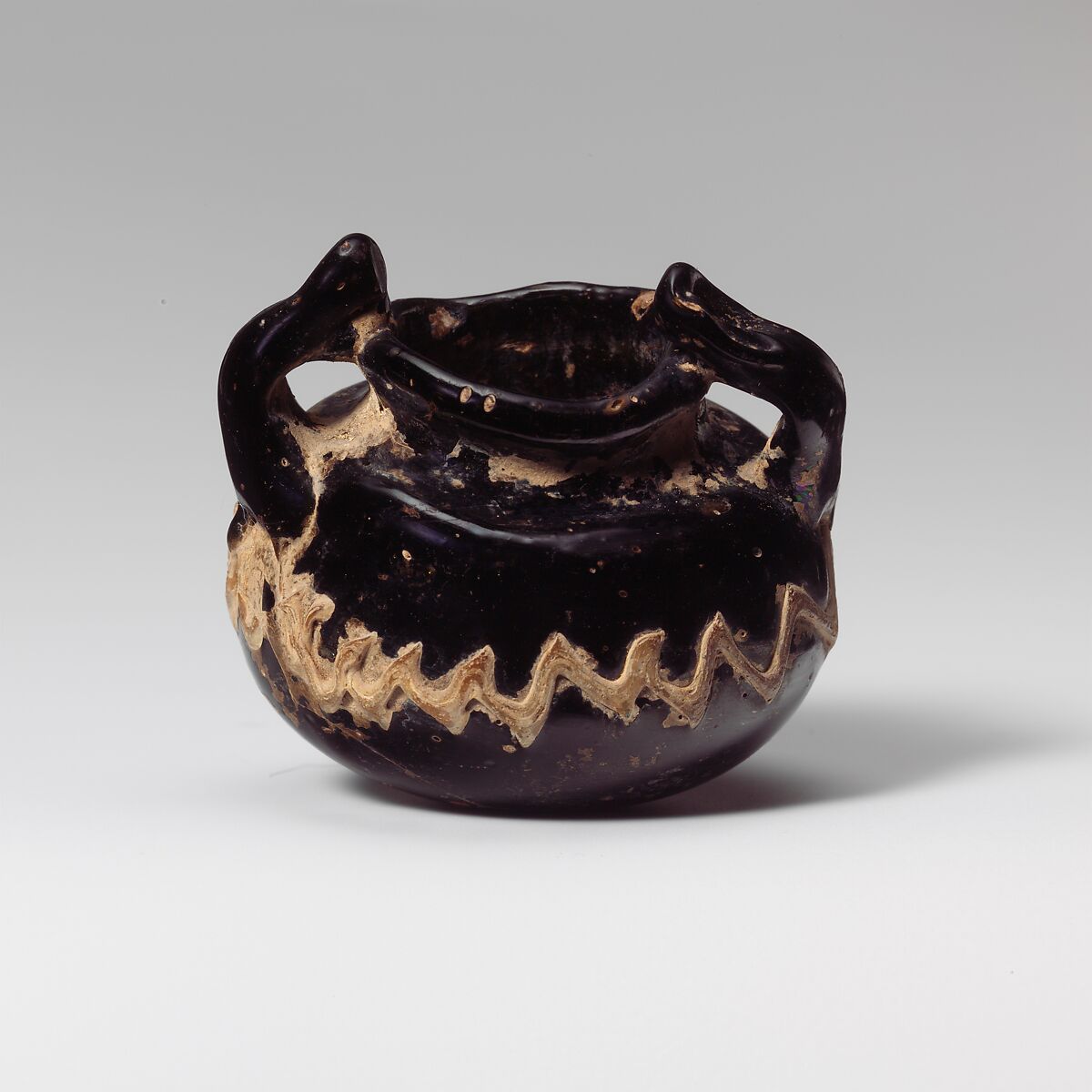 Irregular everted rim; short, concave neck; narrow, almost horizontal shoulder; bulbous, oval body with thick side; round, thick bottom, with off-center semicircular pontil scar; two handles applied to edge of shoulder and top of side over top of trail decoration, drawn up and in, attached to lip of rim, with excess glass looped over and trailed back along left side of handle, with tooled indents at top facing outwards and flattened on inside above rim.