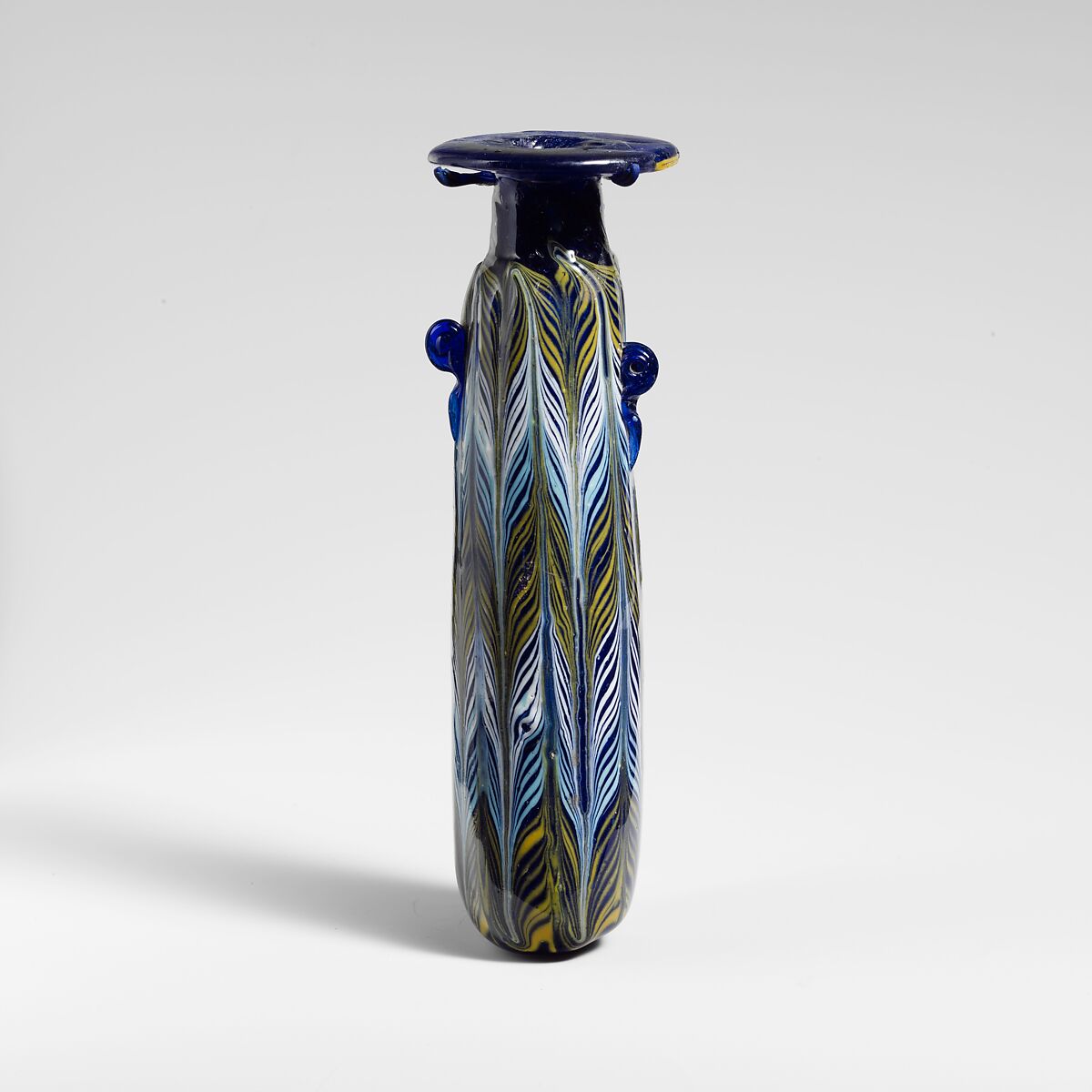 Broad horizontal rim-disk; cylindrical neck, tapering upward; narrow, almost horizontal shoulder; straight-sided cylindrical body, with slight upward taper; convex bottom, with off-center tooling indent and applied small blob of blue glass; below shoulder, two vertical ring handles, unpierced, with trailing tails, one of which is higher up body than the other, applied over trail pattern.