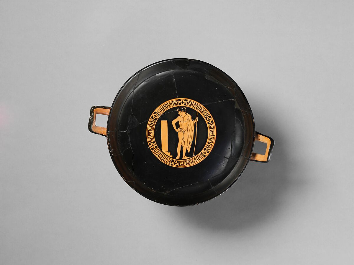 The decoration of this cup, especially on the reverse, shows scenes from the life of men, paralleling contemporary works depicting the life of women.