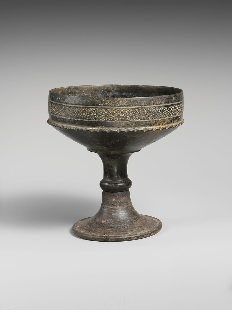 The stamped frieze of circles and dots was made with a cylinder seal rolled across the clay before firing. This type of seal has been associated with workshops in Orvieto.