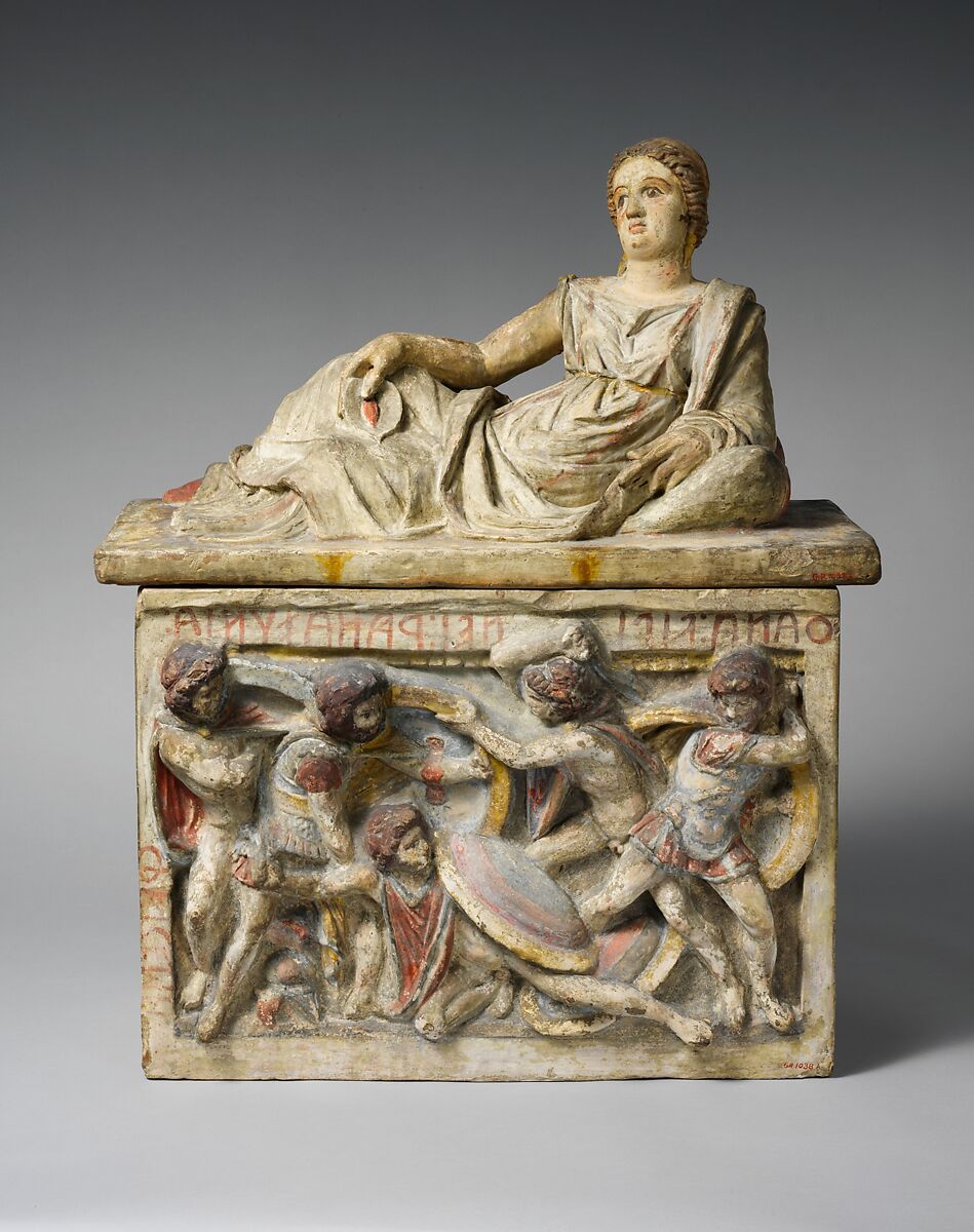 The inscription, THANA : VIPINEI : RANAZUNIA : CREICESA, attests that this is the ash urn of Thana Vipinei Ranazunia, wife of Creice. The last word, CREICESA, is written vertically on the lower left frame of the main panel. The standardized battle scene on the container demonstrates that the subject on that part of the urn often has no apparent connection with the gender of the deceased.