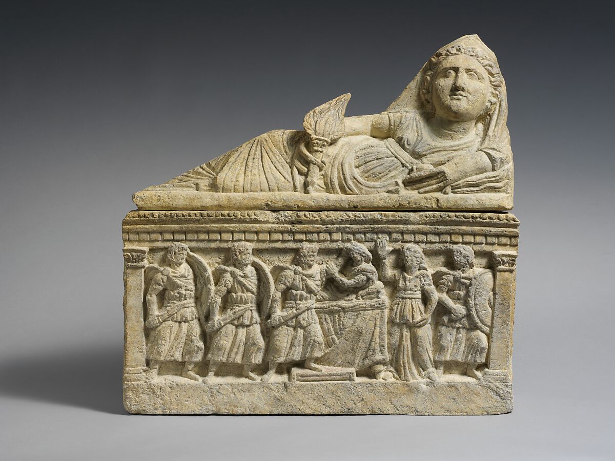 The reclining woman on the lid holds a fan in her right hand and a pomegranate in her elongated left hand. The frieze below depicts the murder of a woman, perhaps Ismene, youngest child of Oedipus and sister of Antigone, or perhaps the Matricide of Alkmene, mother of Herakles. At least twenty other urns, most from Volterra, have been attributed to the same workshop, the so-called Officina di Poggio alle Croci. Vestiges of the original polychromy are visible on the hair of some figures and on the footstool at bottom center.