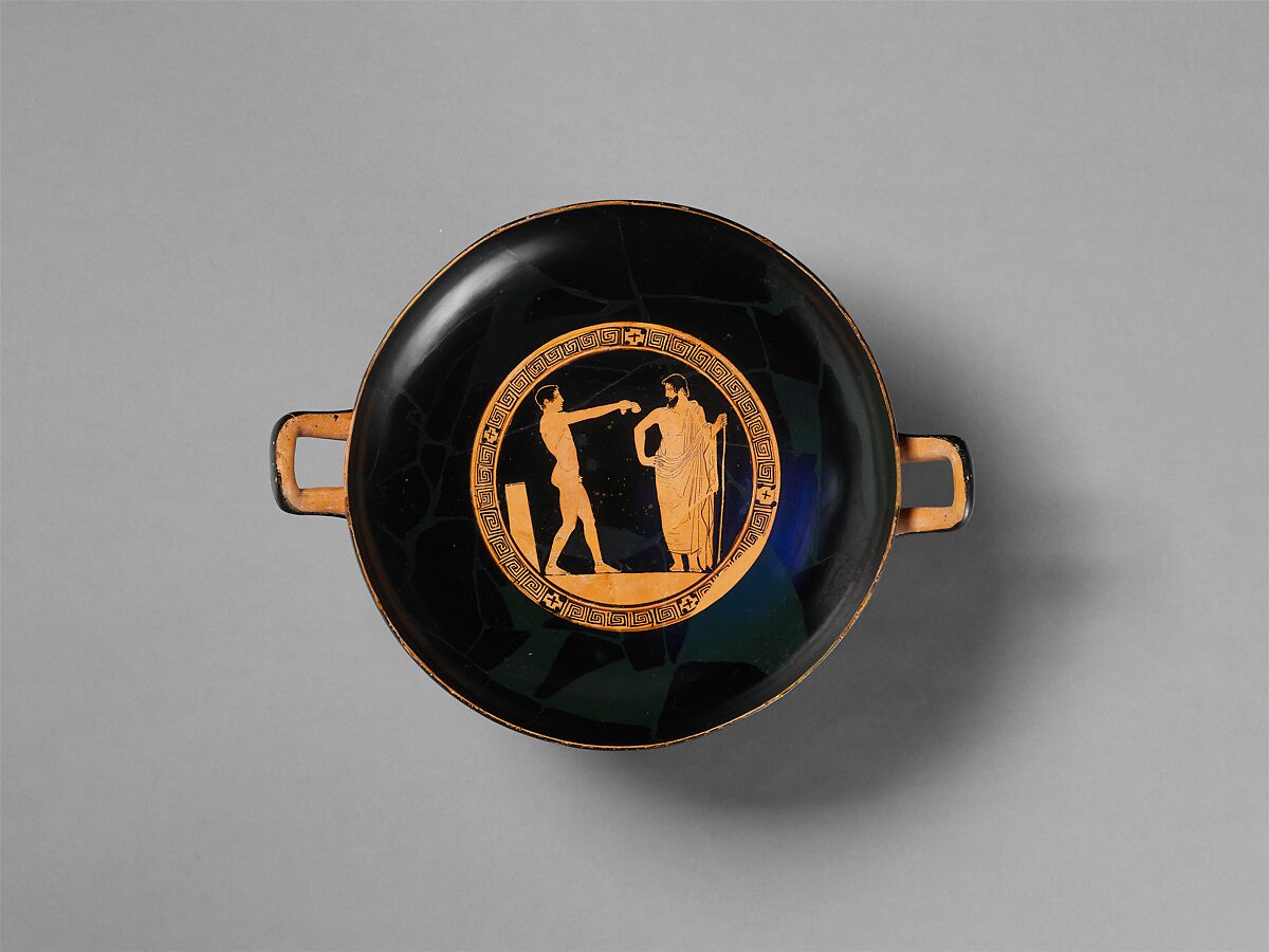 The representations here beautifully convey two fundamental aspects of athletic training, expressed in the Latin saying "mens sana in corpore sano" ( a healthy mind in a sound body). The interior depicts the mastery of a specific sport, in this case the long jump, and the discipline of the body. The exterior shows the easy, serious interchange among young men and their older mentors. The javelins and the strigil establish an athletic setting.