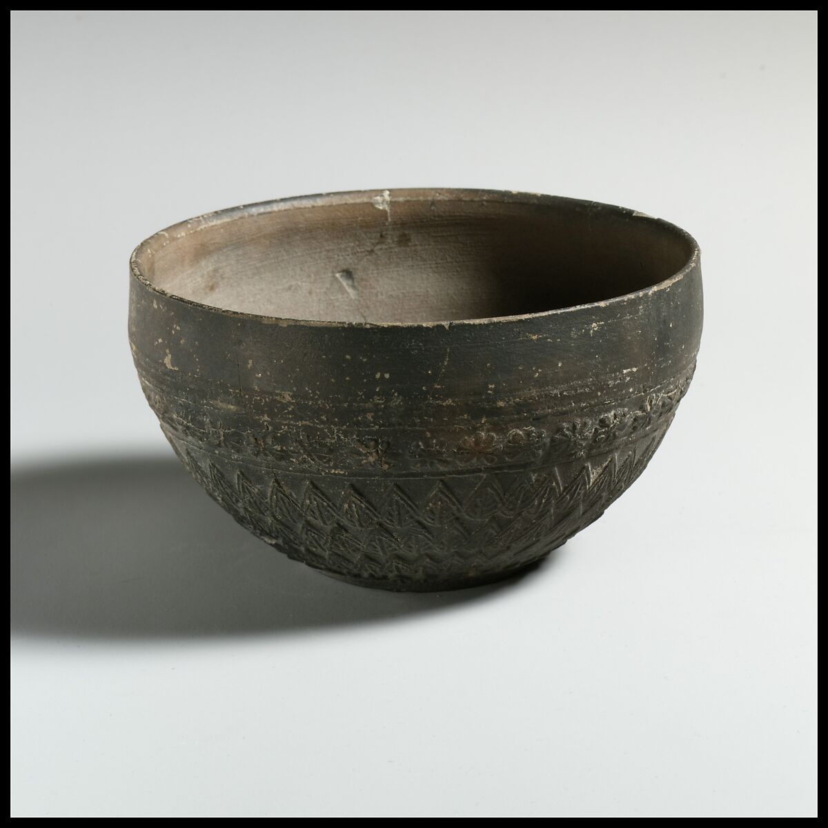 The floral motifs, matt glaze, and in-turned rim of this bowl are characteristics of pottery found in great quantities on the Greek island of Delos, an important trading center in the Cyclades. Potter stamps on many of these bowls, however, suggest that they were in fact made by workshops on the Ionian coast of Asia Minor (Turkey) and then imported to Delos. Bowl fragments with very similar relief decoration to this one have been found in Alexandria, Egypt and Tel Dor, Israel, attesting to the wide export of these ceramics throughout the eastern Mediterranean basin.