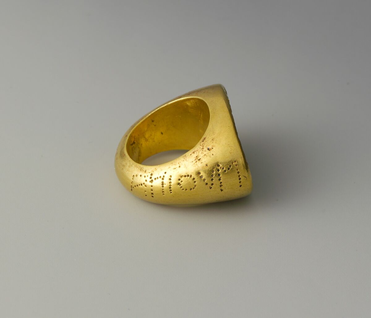 This large gold ring is one of 43 objects in the museum's collection from a single tomb discovered near Bolsena, north of Rome. While the ring no longer has the gem that once filled its sizeable ovoid bezel, it is inscribed on either side with the Etruscan word SUTHINA, indicating that this object was dedicated as a tomb offering. The words were not etched into the ring but rather were formed by a series of small, discrete punched dots. This item of jewelry, along with a number of the other objects in the tomb, probably belonged to the deceased in life and was then marked accordingly upon his or her death.