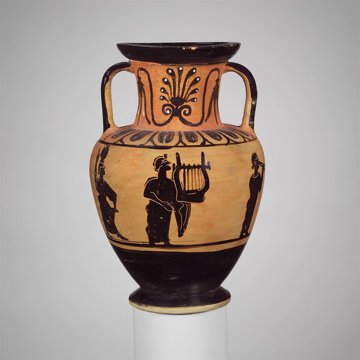 Of the major regions in Southern Italy producing painted vases, only Campania had a significant black-figure output. As the present example indicates, the technique employs a minimum of incision, making it closer to silhouette than actual figure. While dependent on Attic models, a piece such as this one is distinct in the decoration that circles the vase rather than being divided by the handles into front and back.