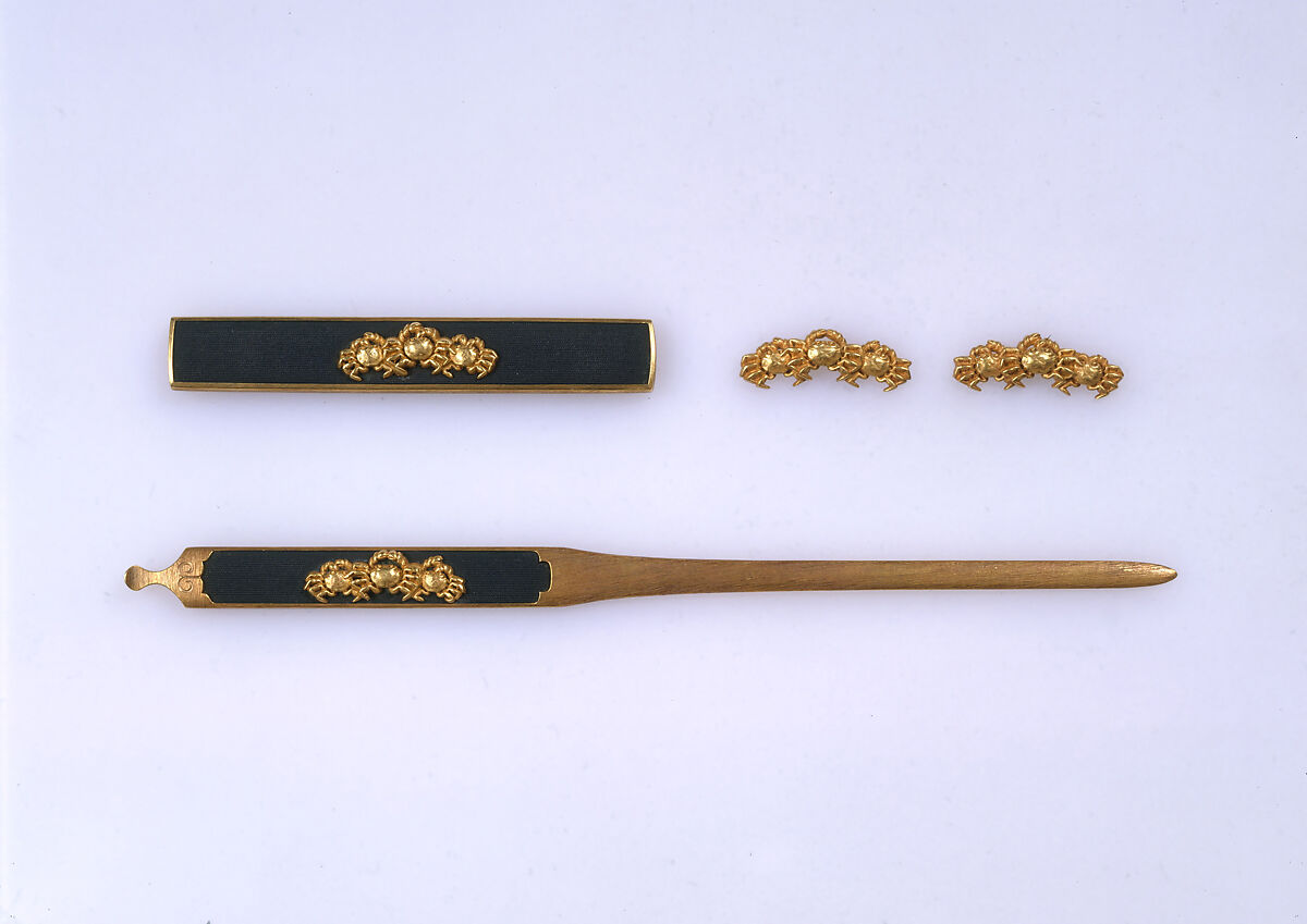 - Dimensions: L. of hair dressing tool (kogai) (a) 8 5/16 in. (21.1 cm); L. of each grip ornament (menuki) (b, c) 1 11/32 in. (3.4 cm); L. of knife handle (kozuka) (d) 3 13/16 in. (9.7 cm)