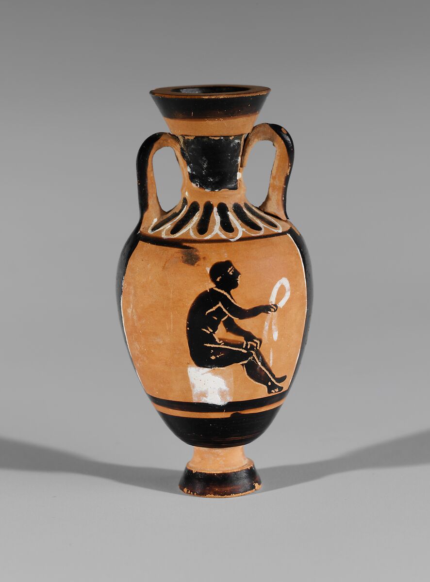 The Bulas Group specialized in miniature versions of Panathenaic prize amphorae. The shape and the representation of Athena follow the models quite closely. The seated athlete holding what might be a fillet is a narrative vignette that would not have appeared on a prize vase.