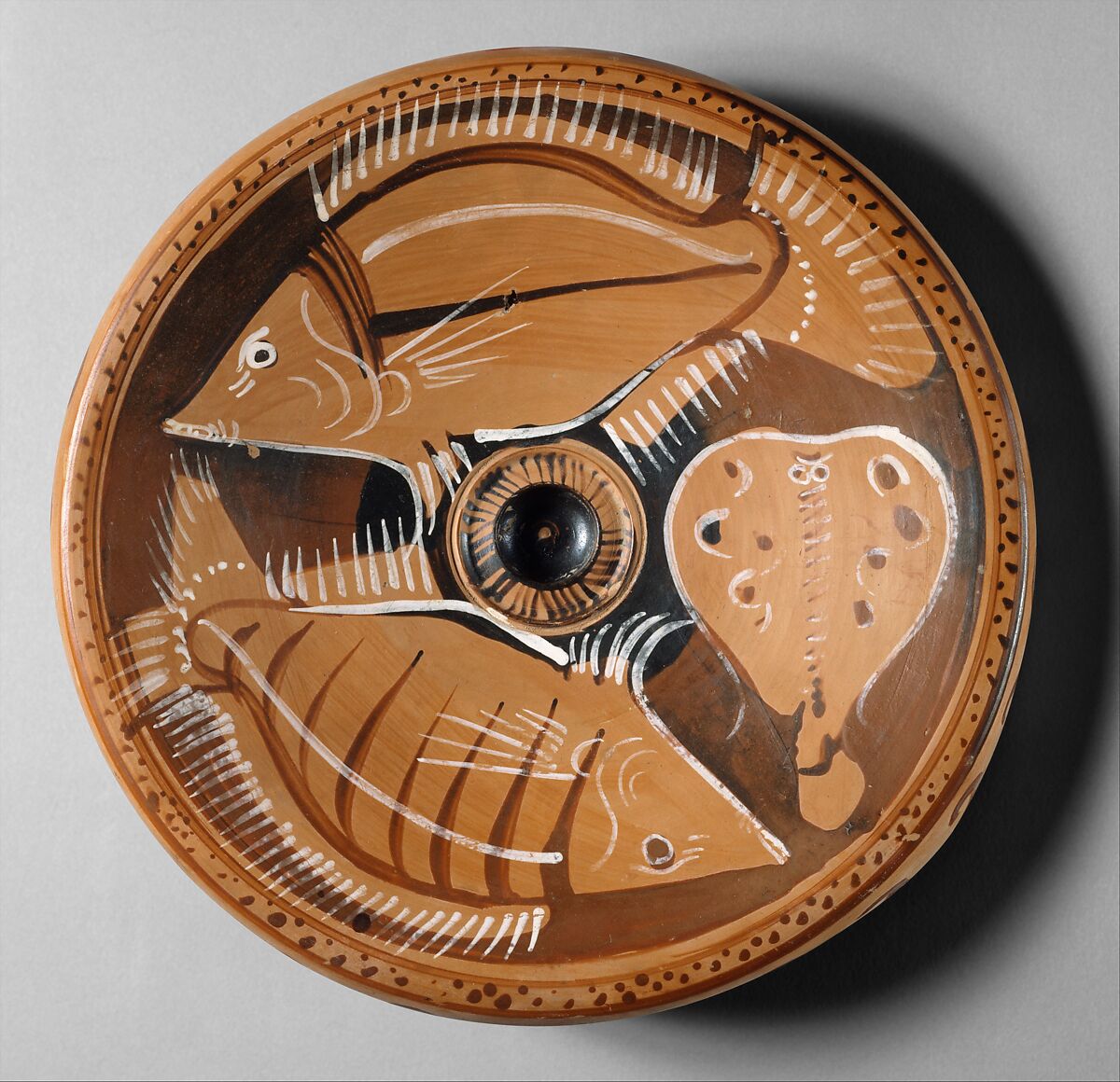 Although this plate is among a group of similar fish-plates by the Bastis Painter, certain features are different. On this piece, the body of the fish is outlined in white, not black, the mouth, eyes, and dots on the body are drawn differently, and the decoration around the central depression is a band of strokes, not the usual wave-pattern.