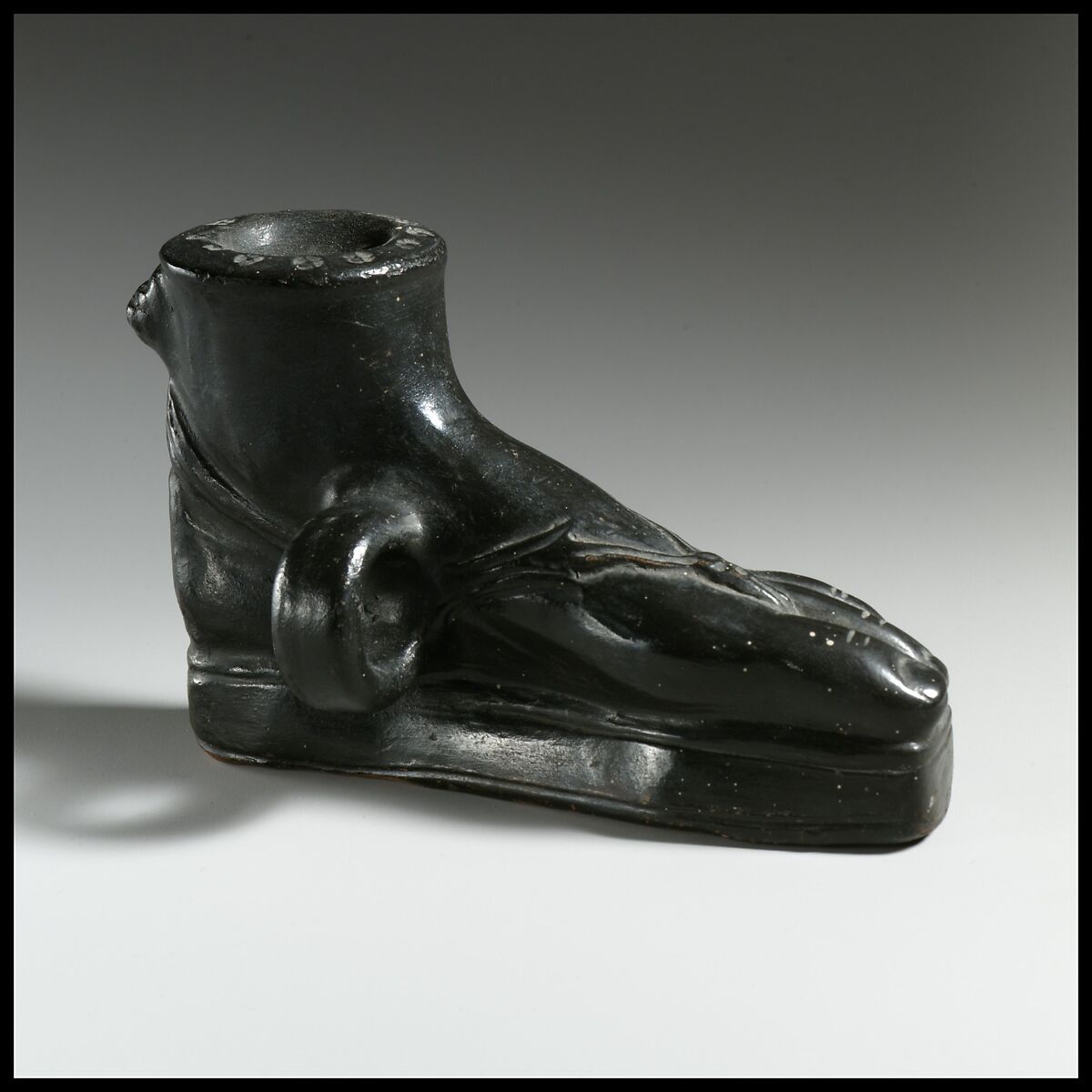 The left foot wears a sandal with a thick sole—perhaps that of an actor? The functional features of the object include the strainer at the top, a small spout in the form of a lion's head, and the vertical ring handle. Vases in the form of sandaled feet occur in Greek art at all periods and in all areas.