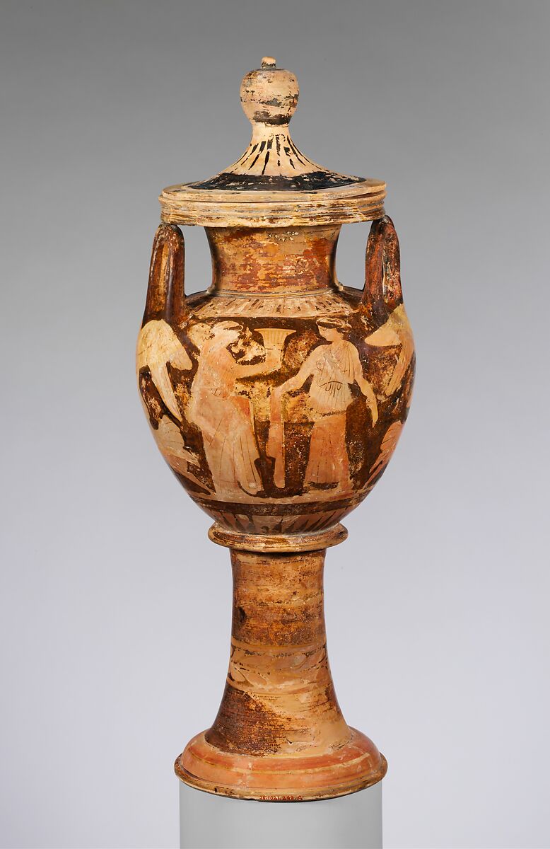 Of particular interest in this representation is the pyxis carried by the woman at the far left. Pyxides are small boxes that contained personal items such as toilet articles. Terracotta examples exist in the greatest quantity, but during the late fifth and fourth centuries B.C., they were also made of marble and often included as offerings in graves.