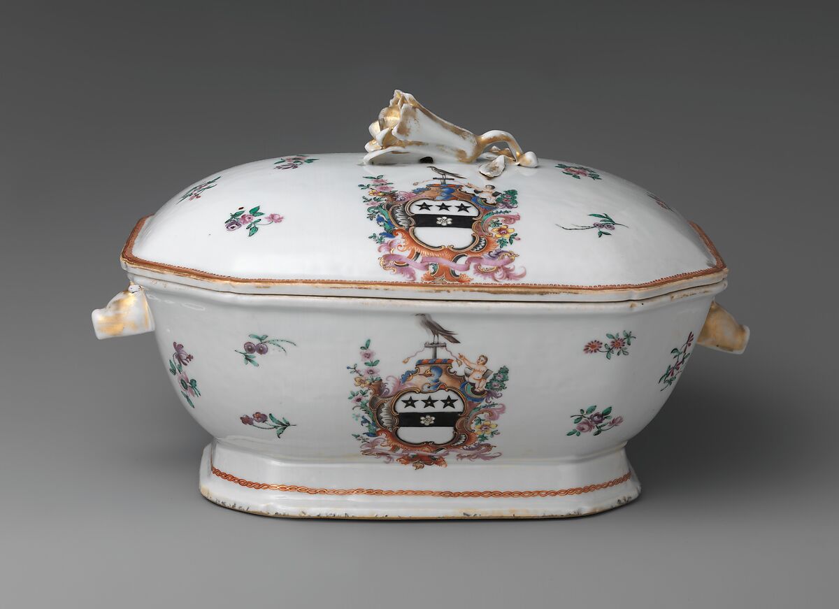 This object belongs to a large dinner service (10.149.1–.248) bearing the Townley family coat-of-arms. The service, probably ordered by Justice Samuel Chase (1741–1811) of Annapolis, Maryland, displays the enamel-painted arms of Margaret Townley, Chase's aunt.