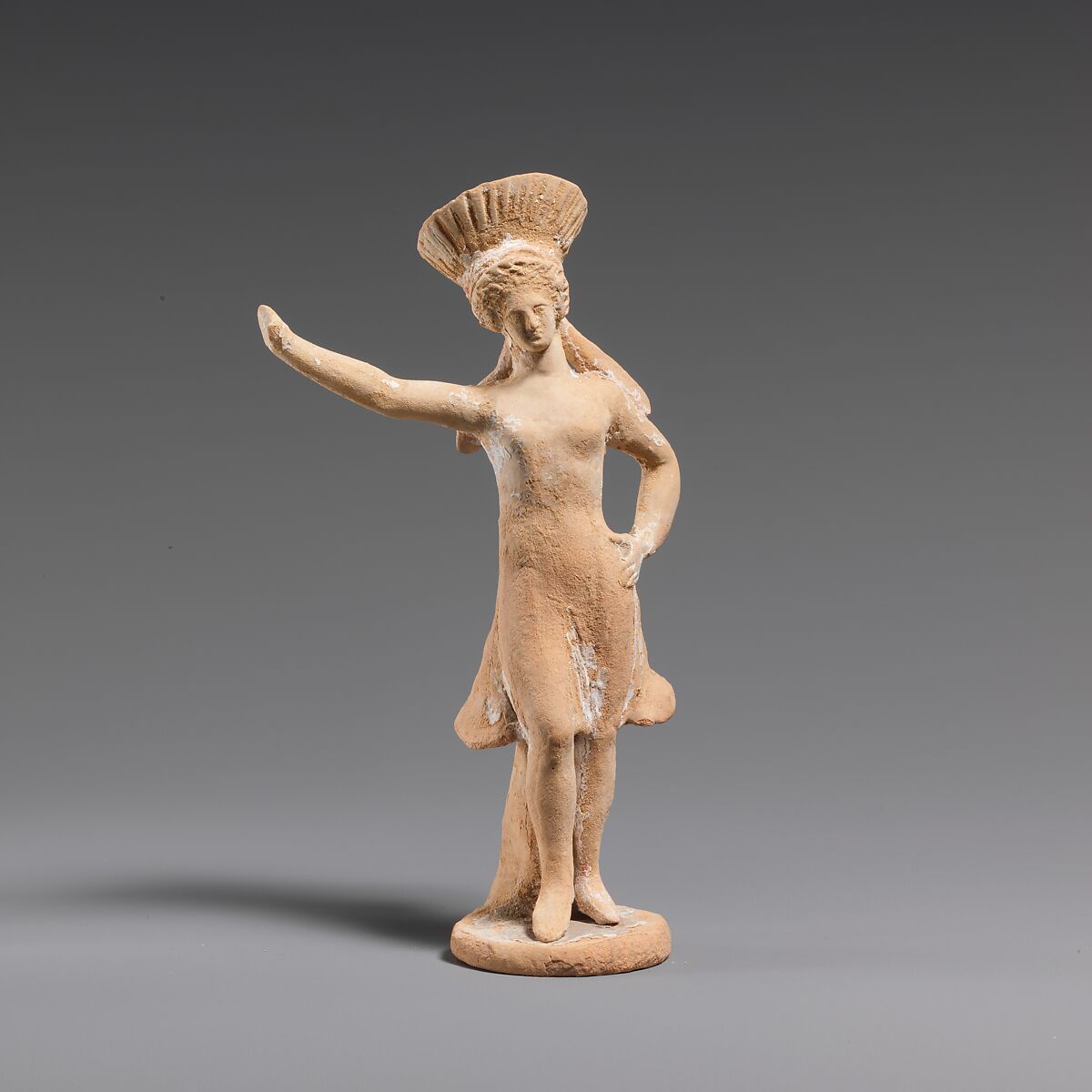 Female dancer, toes touching base, propped up by support in back. Right foot advanced, right arm raised, left hand on hip. Wearing a flaring, striped headdress (a kalathiskos) with two fillets falling to shoulders in back. Garment is a knee length chiton. Red stripe on right leg suggests boots. Round, flat base.