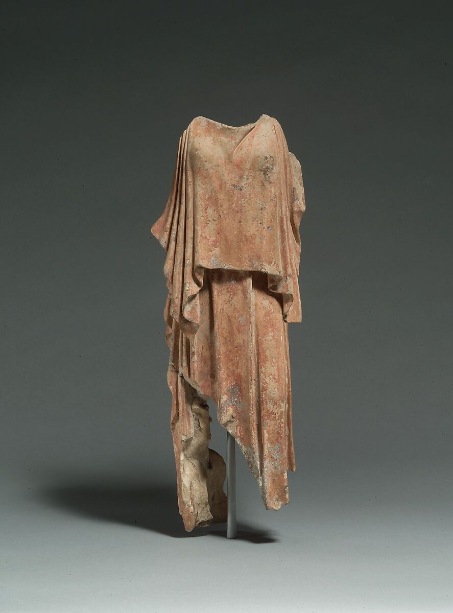 The sculptural type of a woman wearing a peplos becomes prominent during the second quarter of the fifth century B.C., especially in small bronzes. Contemporary works in terracotta on this scale are exceedingly rare. It is possible that this piece served as a model for the preparation of molds from which bronze representations would have been cast.