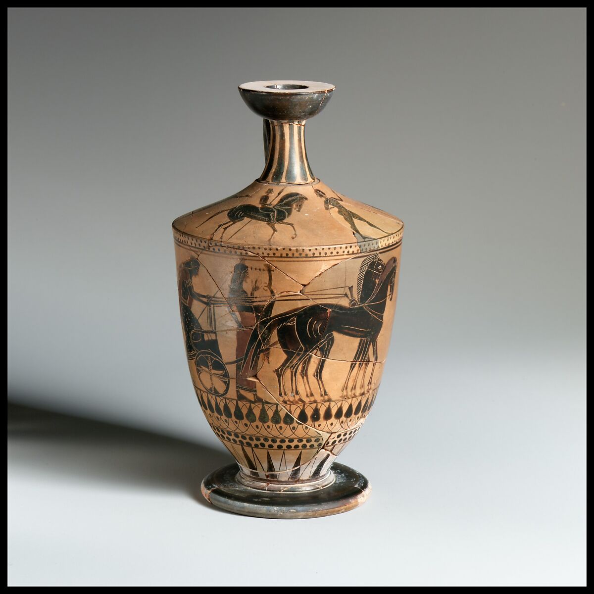 The grayish color of the clay indicates that the vase was in a fire, possibly a funeral pyre. The palmette ornament under the handle is adopted from neck-amphorae.