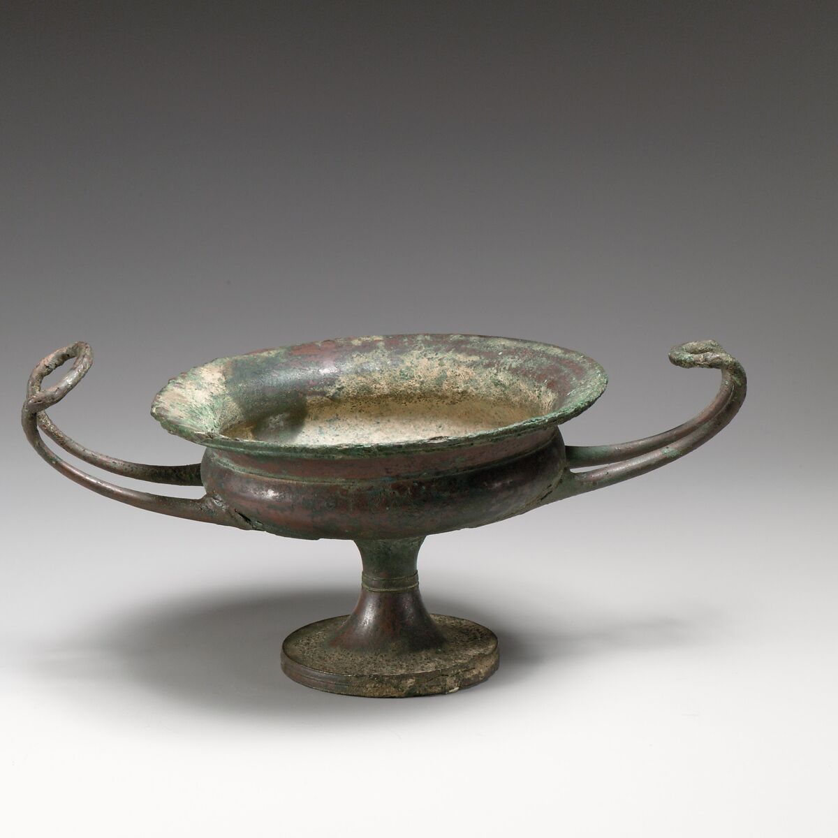 This bronze kylix follows in shape and proportions the same fashion also encountered in silver cups and black-glaze terracotta kylikes made under the influence of metal vases. The type was very popular and has been found in many areas of the Hellenistic world.