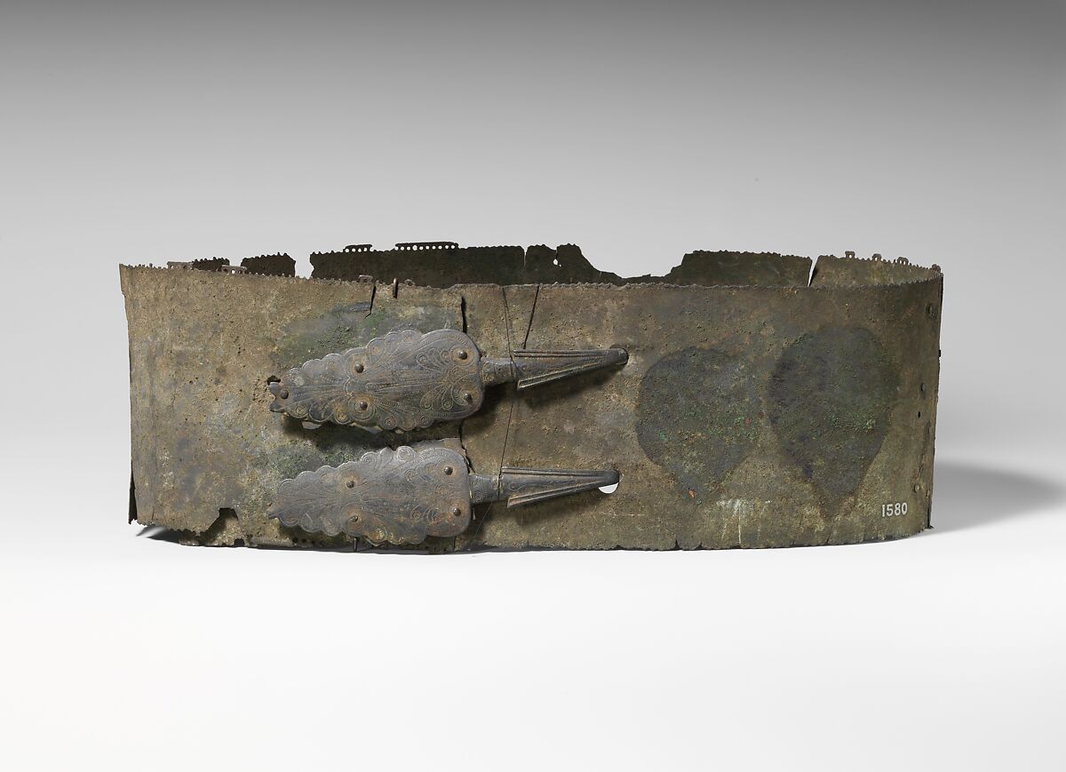 Wide bronze belts with several clasps, often in the shape of palmettes, are well known from finds, especially in the regions of Apulia, Lucania, and Daunia, and from representations in Campanian and Lucanian painting. The term Samnite applies to one of the indigenous peoples of Southern Italy whose language was Oscan—thus, for instance, the Oscan warriors on Apulian vases. The belts are connected with warriors and often occur in graves with other military equipment.