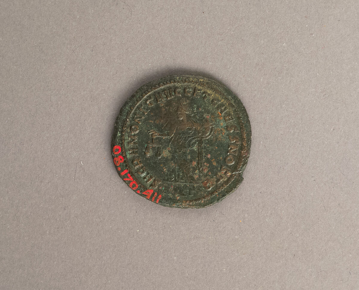 CONSTANTIVS NOB CAES, head of Constantius as Caesar (junior tetrarch)/SACRA MONET AVGG ET CAESS NOSTR, Moneta holding scales and cornucopia