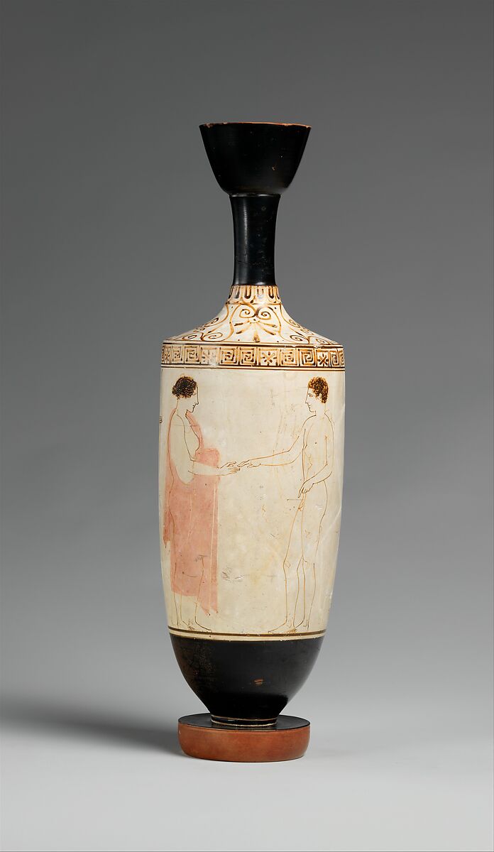 The pigment of the youth's himation (cloak) is lost. The scene may be one of greeting or farewell. Because white-ground lekythoi served as funerary vases at this time, the subject is probably one of farewell, set in the woman's quarters of a house.