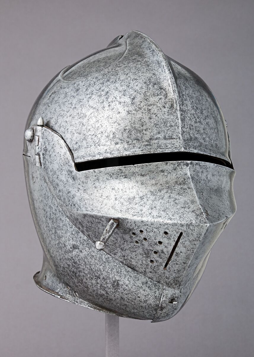 The armet was the typical head piece of the fully armored equestrian knight throughout most of the fifteenth century, and its smooth, compact, rounded form typifies the streamlined appearance of fifteenth-century Italian armor in general. The armet's close-fitting form necessitated its highly practical and ingenious construction, with cheeckpieces hinged to the bowl that opened to admit the head. The vulnerable areas that resulted where plates overlapped, particularly at the front of the chin and along the edge of the visor (which, incidentally, was not fastened closed to the cheekpieces but was merely held down by its own weight), were protected by the addition of the bevor that fit over the lower front half of the helmet. The bevor also protected the front of the neck, which was otherwise covered by the collar of a mail shirt worn underneath the armor and by the mail fringe suspended from the edge of the armet. The ventilation holes in the visor are only on the right side, so that the more exposed left side, which usually bore the brunt of blows, was not weakened.