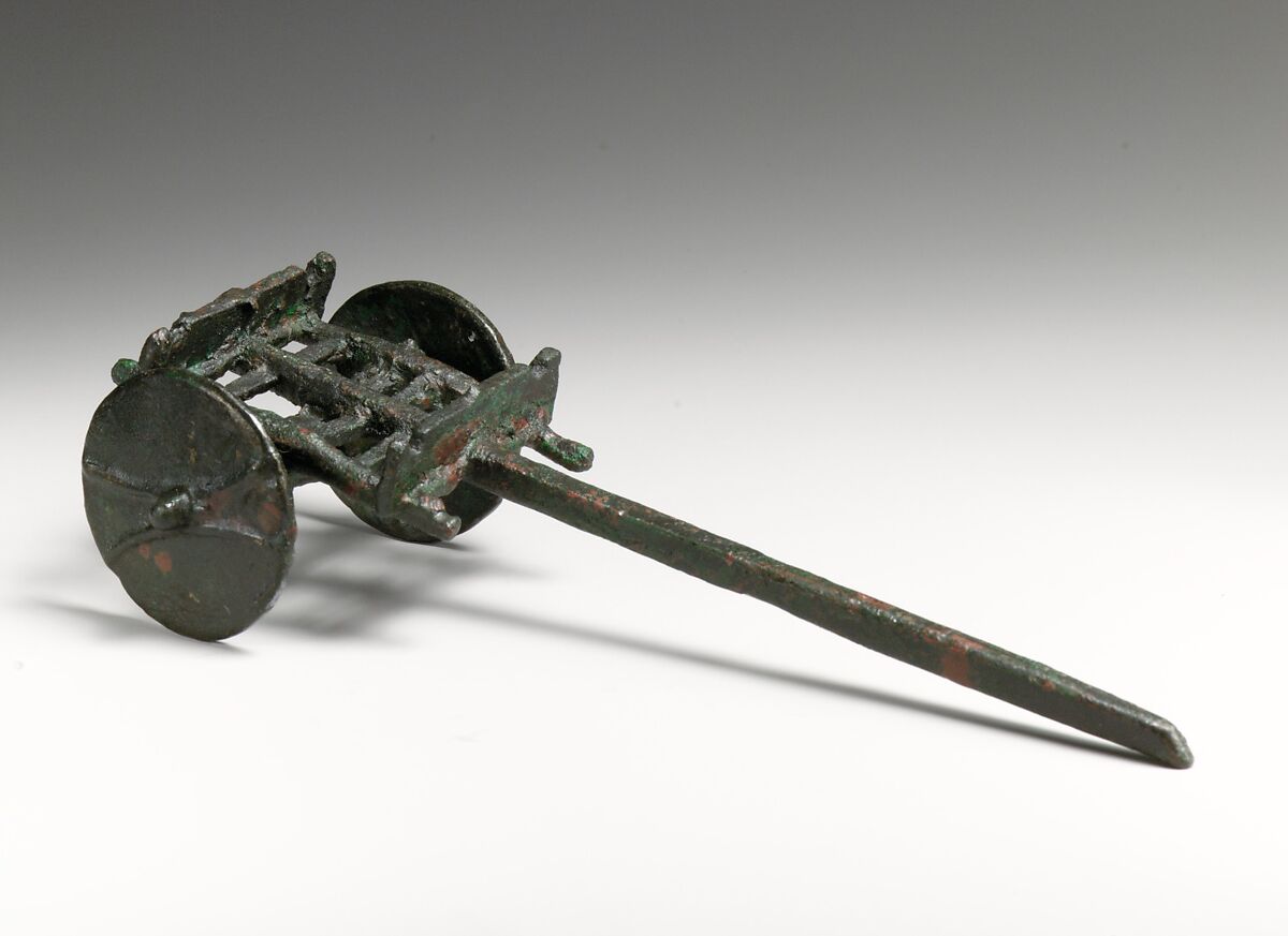 This farmyard group consists of a cart, a plough, two bulls, two oxen, two sheep, two goats, and two pigs. All fourteen pieces are said to have been found together and probably comprised a votive offering or a child's toy. The plough was cast in one piece of bronze, but the joints of the wooden original model are still all indicated. The wheels of the cart are of a type used by the Etruscans. The shape of the cart has parallels in Roman iconography. For example, it is similiar in style to carts used for the transportation of food or baggage on the Column of Trajan in Rome from the second century A.D.