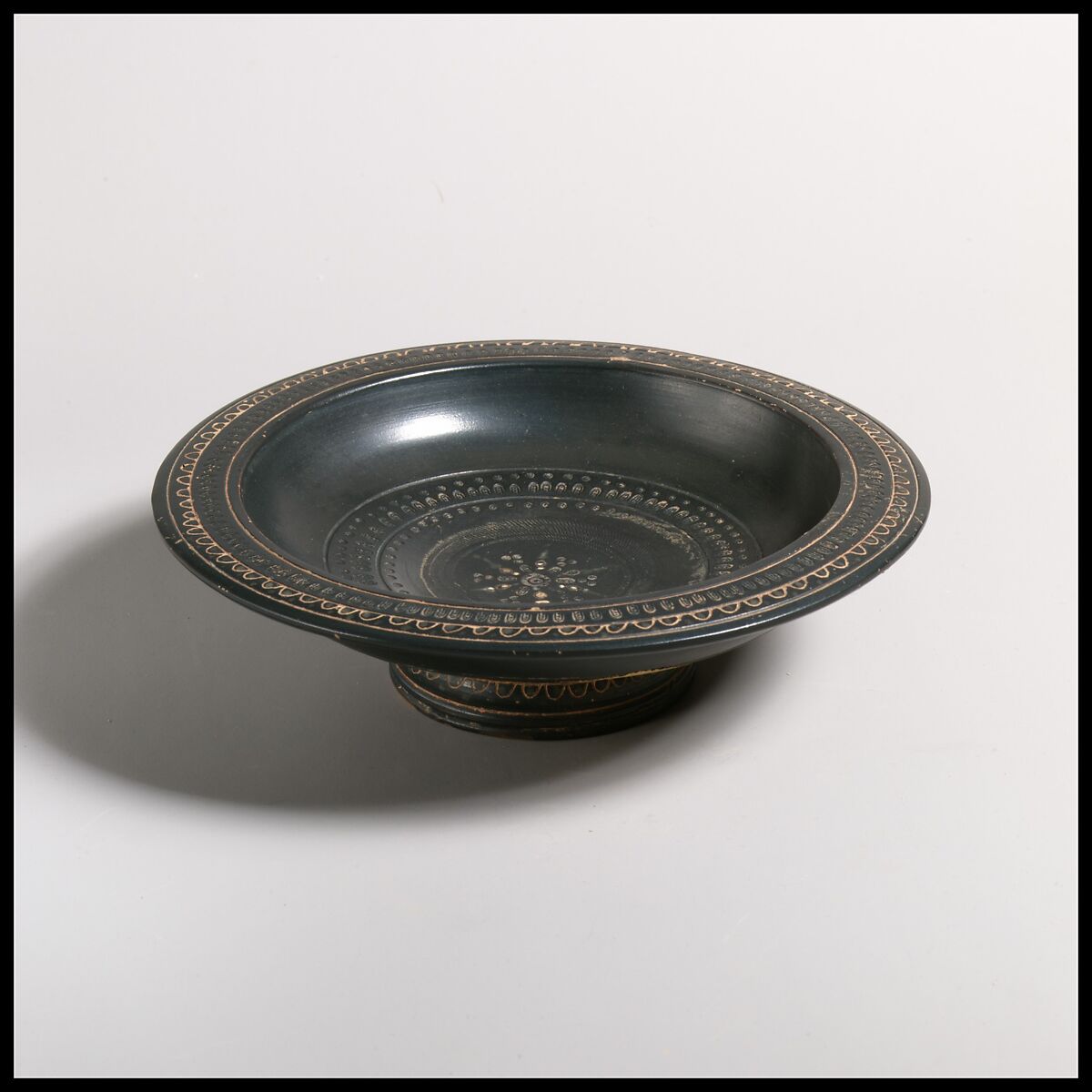 Shallow dish with ring base, decorated with stamped pattern.