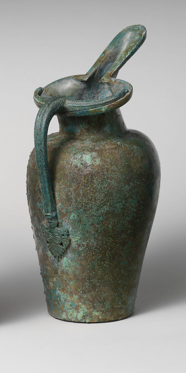 This type of beaked jug was probably produced in Vulci. It was exported to many sites in Italy and Central Europe, especially to the Celtic peoples living in the areas of present-day France and Germany.