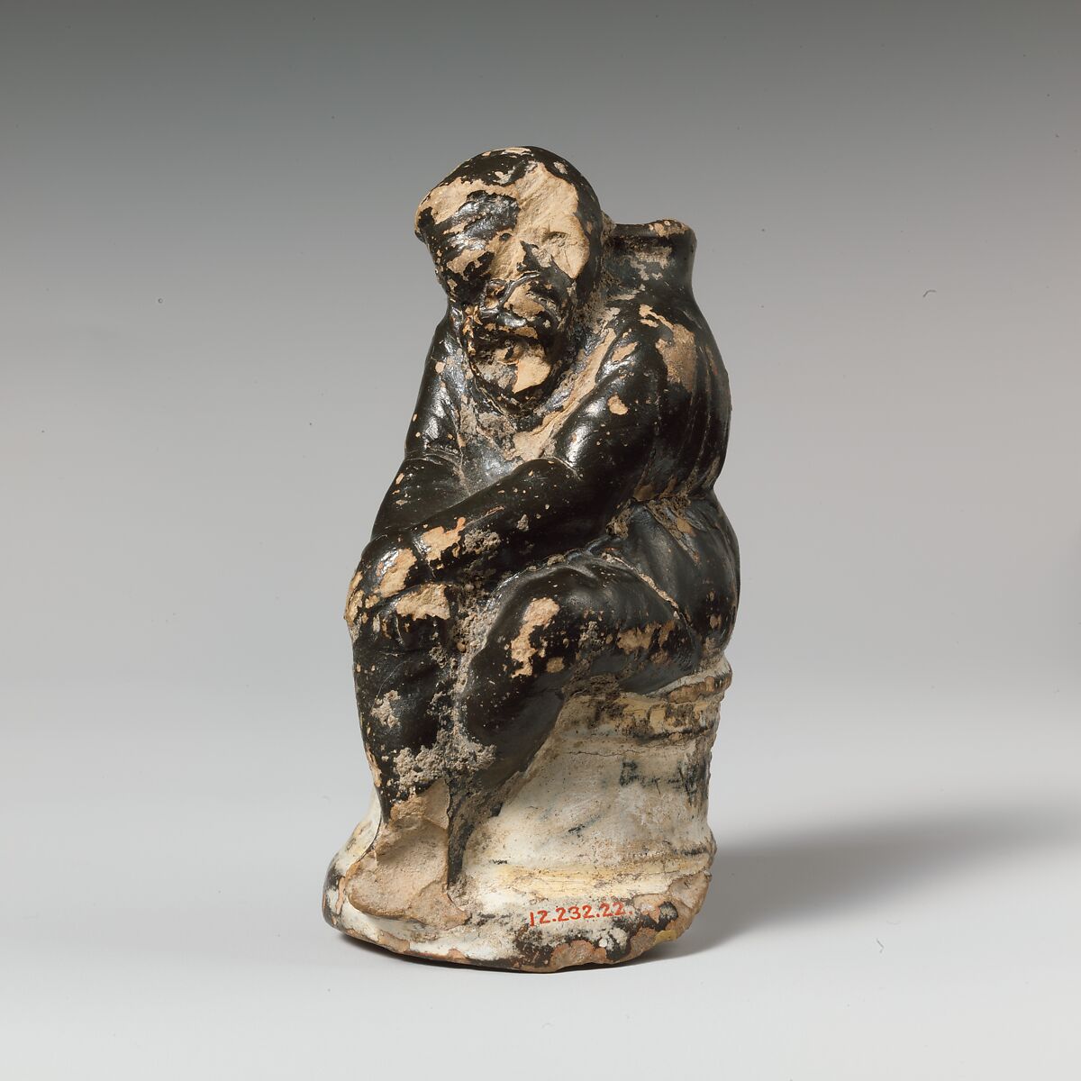 The flask is in the form of a comic actor, a slave, seated on an altar.