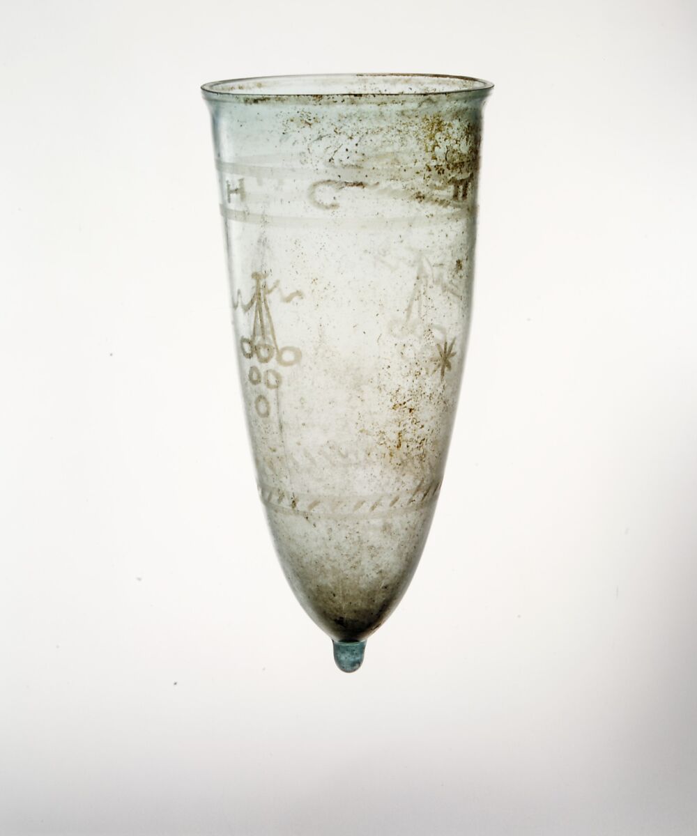 The Greek inscription PIE ZHCHC (Drink [so that] you may live [well]) is an exhortation commonly found on both pottery and glass vessels. It probably echoes the kind of toast that would have been given at a drinking or dinner party. This beaker was likely made and decorated at a workshop in Syria, demonstrating that glassmakers (vitrarii) worked closely with glass cutters (diatretarii) in the production of glass tableware.