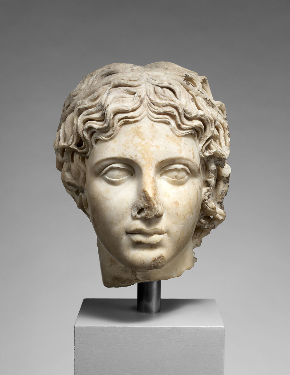 This idealized head is carved in a manner that brilliantly evokes the qualities of metal in the medium of stone. The polished flesh, sharply outlined eyes, and individualized locks of hair were all typical features of bronze sculpture that were imitated in marble as part of the classicizing taste that prevailed during the reign of the emperor Hadrian in the early 2nd century A.D.