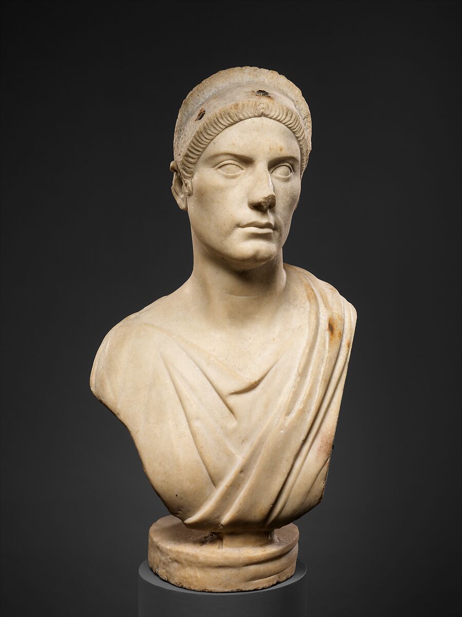 This portrait of a stern Trajanic matriarch has much in common with images of Trajan’s wife, the empress Plotina. Two ancient points of attachment in the front