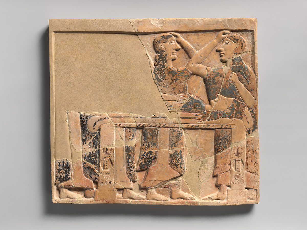 During the Archaic period, burial shafts in Attica were often covered by solid, rectangular, house-like structures with plastered mud-brick walls and slightly sloping roofs. A series of terracotta plaques showing different stages of the funeral were probably set into the outer walls. In this very early example, the deceased is shown lying on a bier surrounded by mourners.