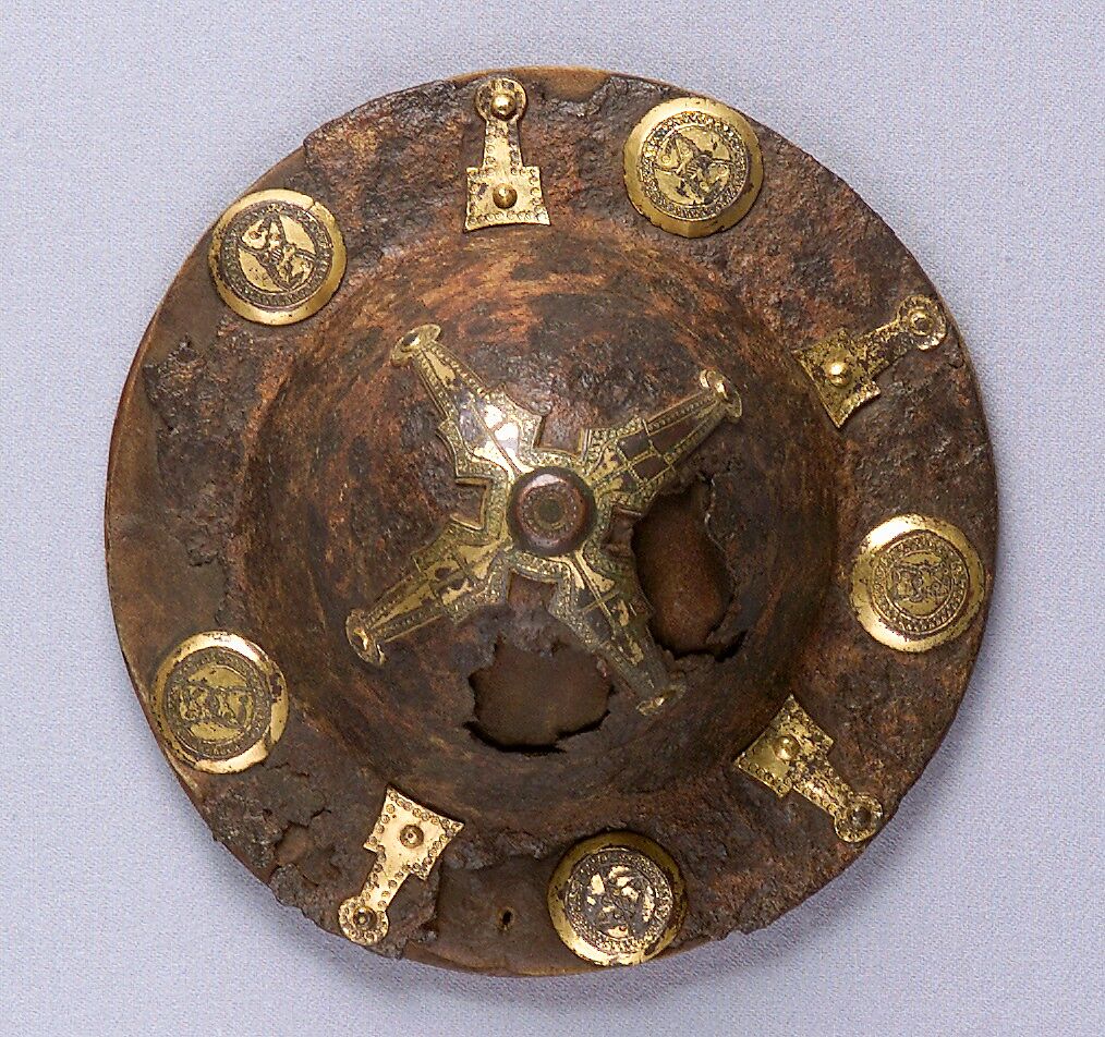 The crosses and fish that decorate one of the bosses suggest that its owner was a Christian. The bird-headed spiral on the other boss is an older symbol derived from the Langobards' pre-Christian past.