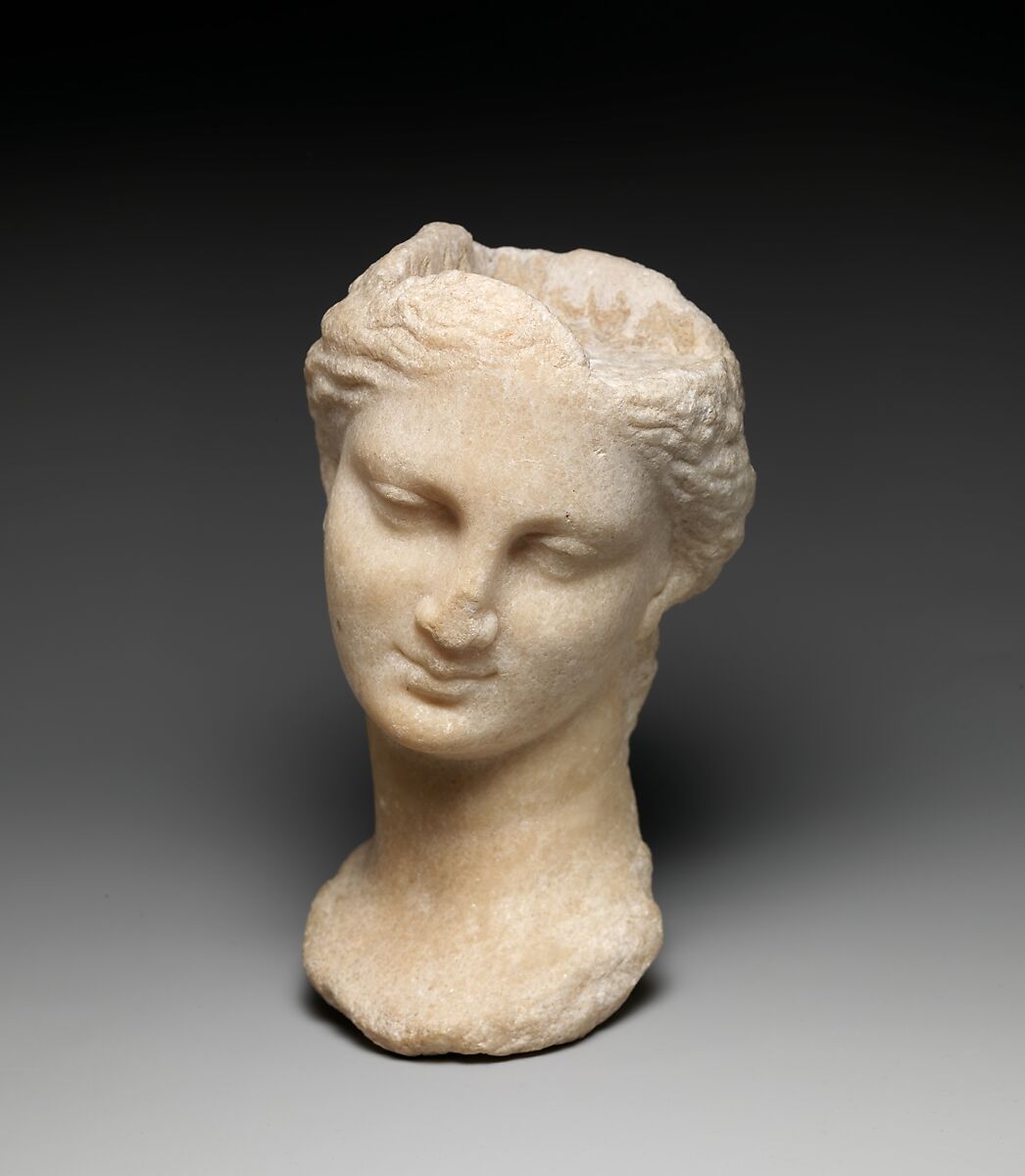 The oval face with delicately indicated features and gentle transition to the soft hair is executed in a style popular in the Hellenistic period. The head was made for insertion in a small statue. Some attribute or possibly the fixture for a veil must have been set into the square-shaped depression at the top.