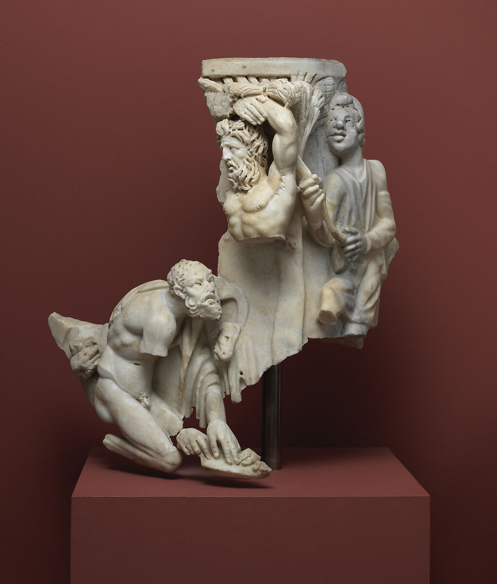 - Title: Right corner of a marble sarcophagus with the myth of Apollo and the satyr Marsyas