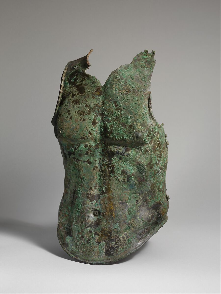 Body armor, and specifically the cuirass that covered the front and back of the torso, provides a contemporary indication of artists' treatment of the human body. This one shows as sensitive and beautifully executed articulation as one might see on a classical bronze statue.