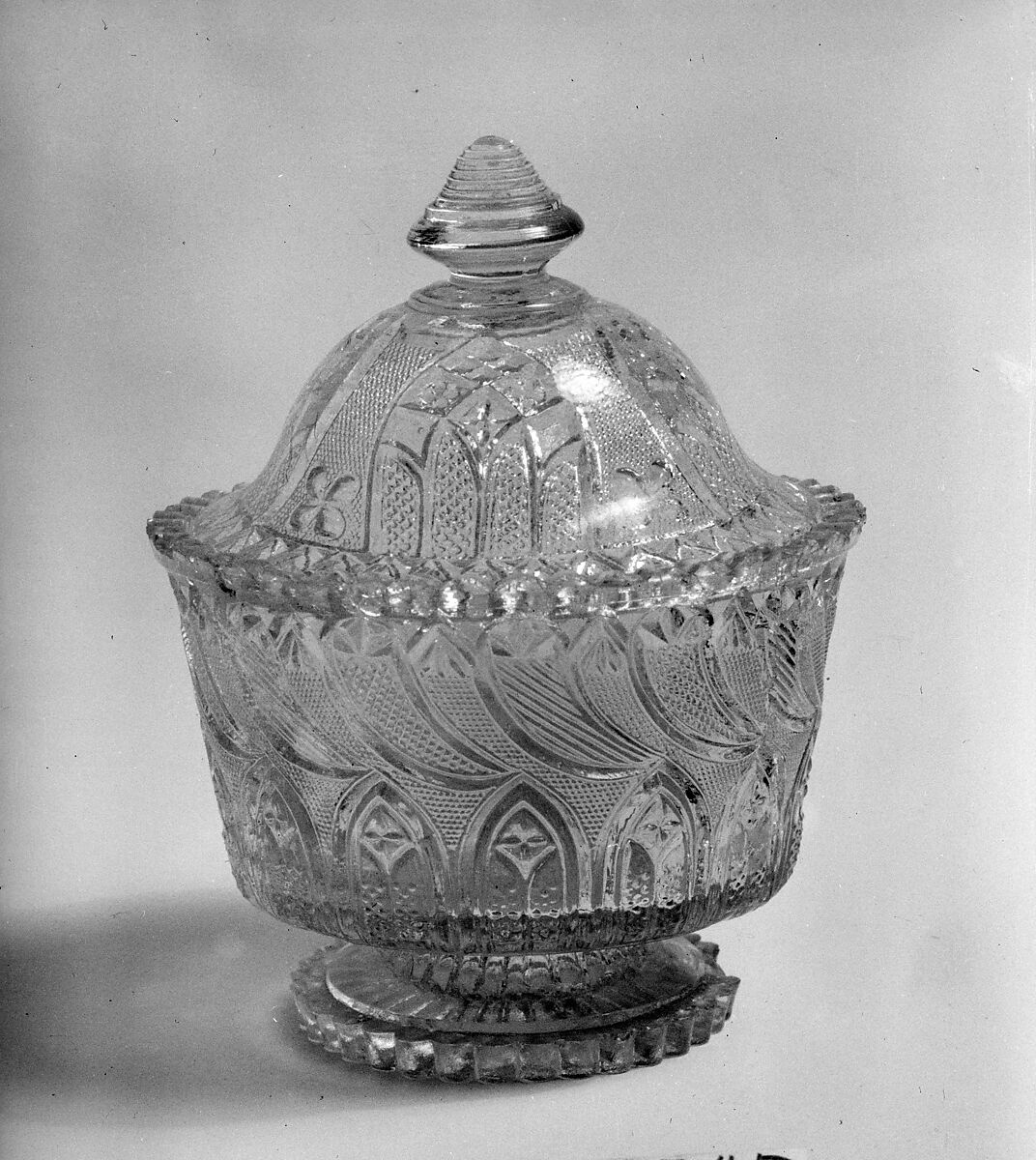 This covered glass bowl is pressed in two patterns, peacock feather and gothic arch.