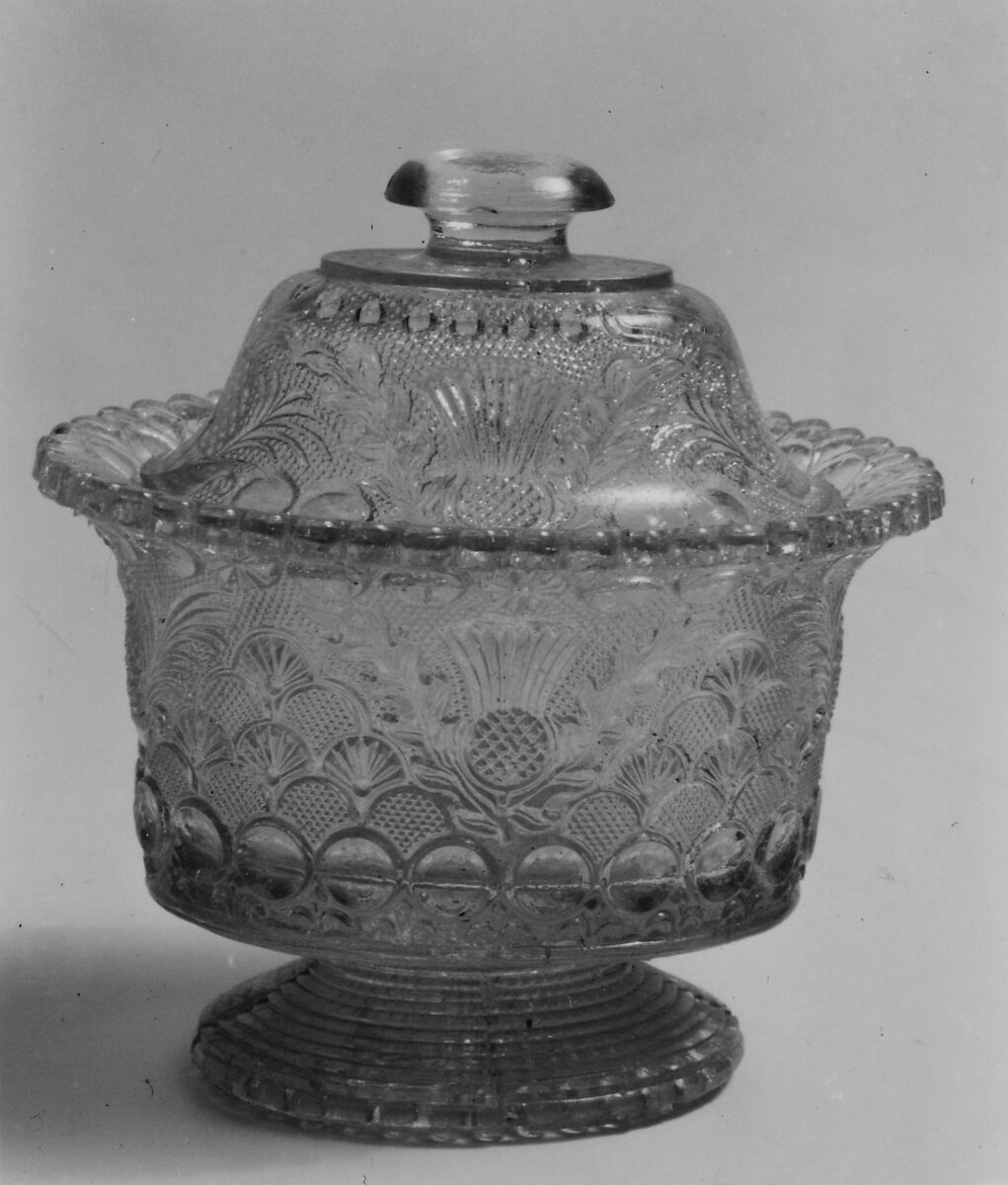 This covered sugar bowl is pressed in pineapple, thistle, circle, and shell patterns.
