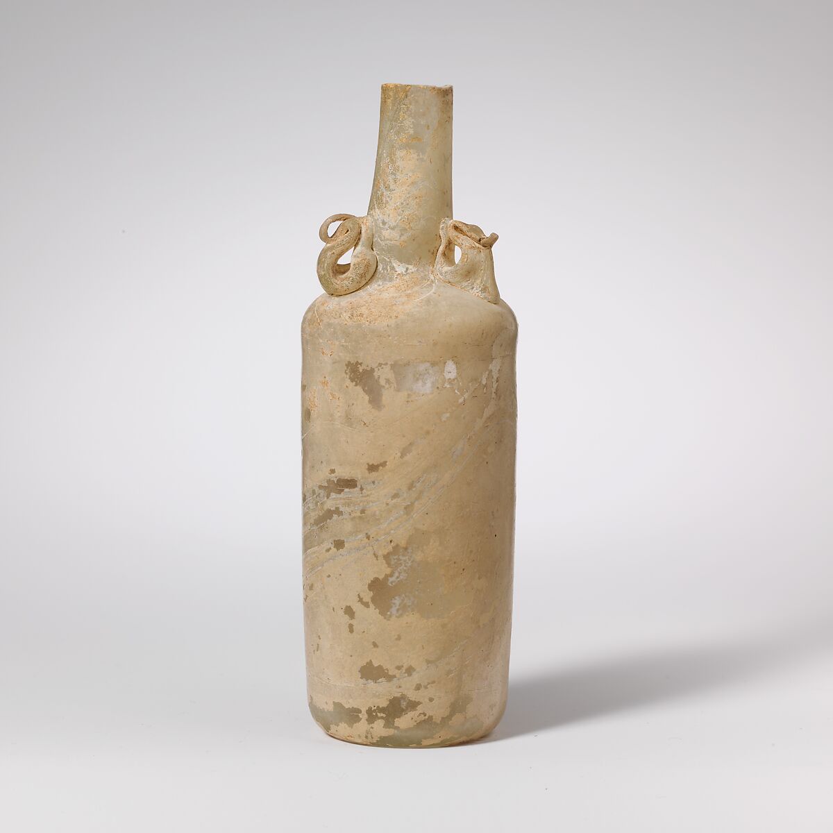 Body complete, but broken at rim and neck with some losses; bubbles and striations; dulling, creamy white weathering, and iridescence.