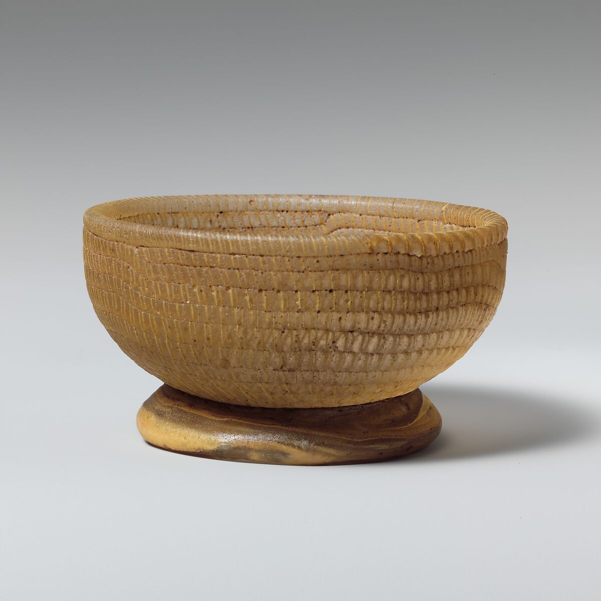 Similar glass bowls have been recovered from the Antikythera shipwreck, located south of the Peloponnese. This first underwater excavation in Mediterranean waters was undertaken with the assistance of sponge divers in 1900. The ship is thought to have been heading west when it sank sometime in the second quarter of the first century B.C. with a large cargo of terracotta amphorae, glass vessels, and large-scale sculptures of bronze and marble.
