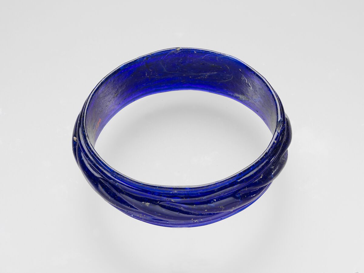 On outer surface, two narrow ribs at sides running around band, flanking broad projecting rib decorated with twelve diagonal grooves.