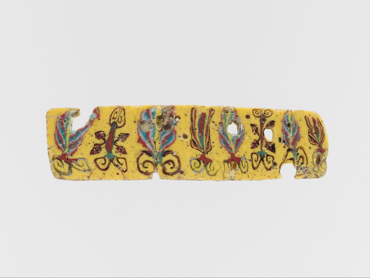 Opaque yellow ground; decoration in opaque white, red, and greyish green, and translucent deep purple appearing black.