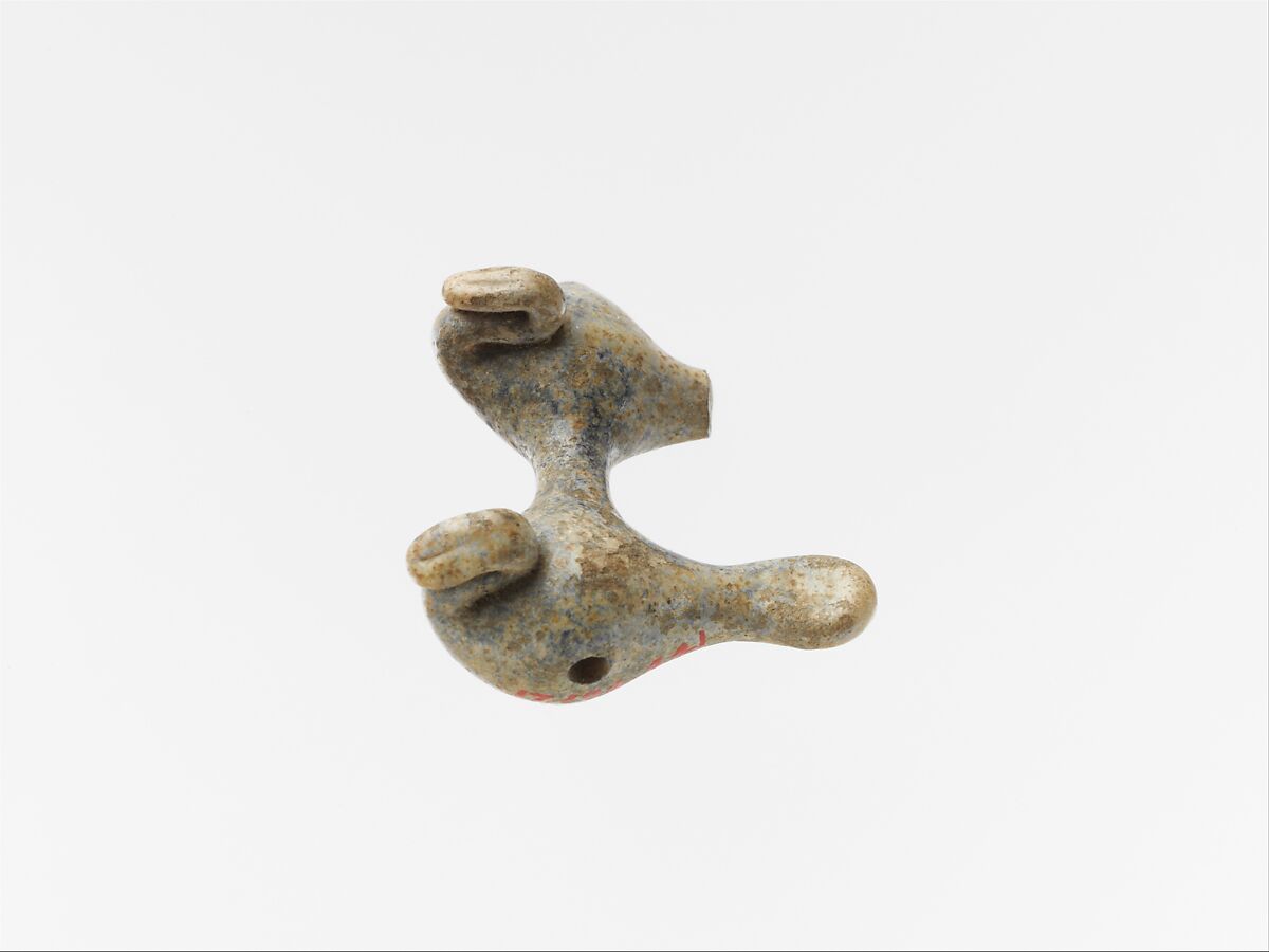 Double bead with central transverse hole, pierced through bodies and bridge from right to left, shaped as two birds, each tooled into S-shaped head and drawn out into a flattened broad tail, joined by a cylindrical bridge on side of body.